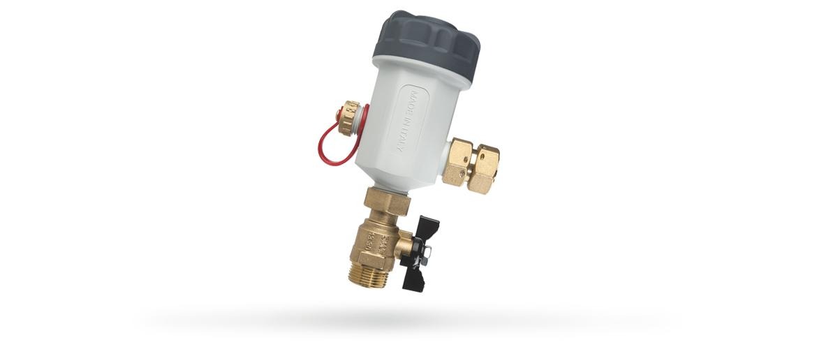 FDM-1P puede instalarse con diferentes orientaciones; en caso de espacios limitados debajo de la caldera (ej. caldera instalada en estantes de cocina) FDM-1P debe instalarse con el cuerpo principal horizontal y el tapón mirando hacia delante. Si hay más espacio para la instalación, es posible colocar el FDM-1P con el cuerpo vertical y el tapón mirando hacia abajo. Para permitir estas configuraciones de instalación es suficiente invertir la posición del racor giratorio de conexión de la caldera con la válvula esférica y girar el filtro 90°. Las conexiones del cuerpo principal han sido realizadas con rosca G 3/4”; la descarga, con rosca G 1/2” FDM-1P se suministra con válvula esférica y racor giratorio de latón.