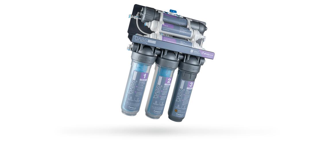 Oasis Sanic es un sistema de ósmosis inversa bajo fregadero para uso doméstico con tecnología antimicrobiana, diseñado para mejorar el agua potable.